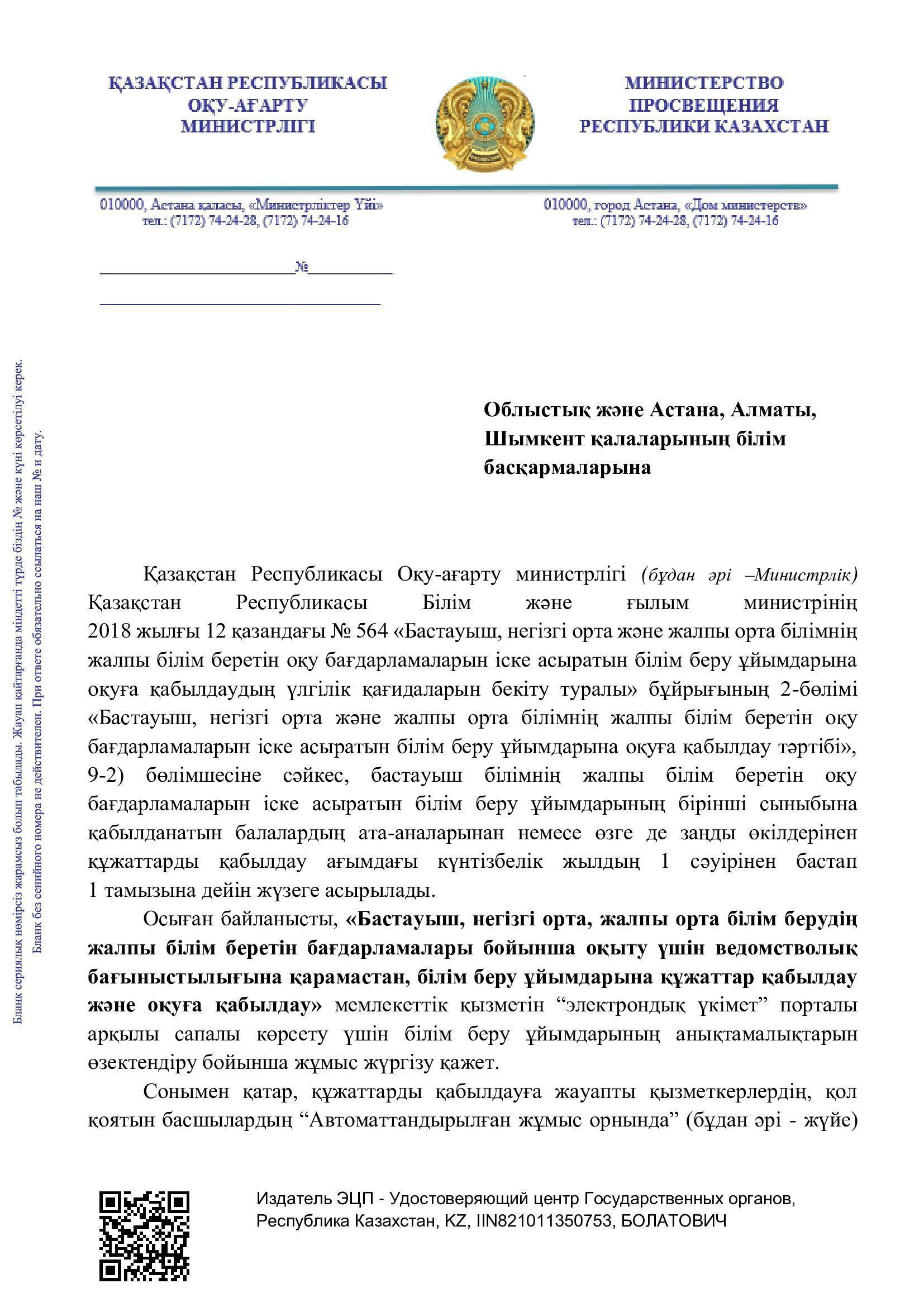Бірінші сыныпқа қабылдау 2021-2022 оқу жылы