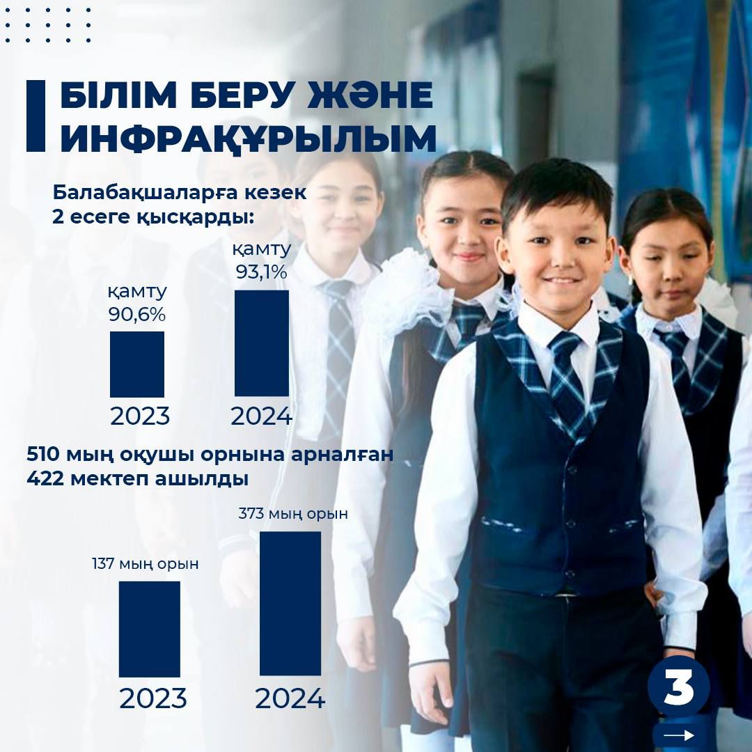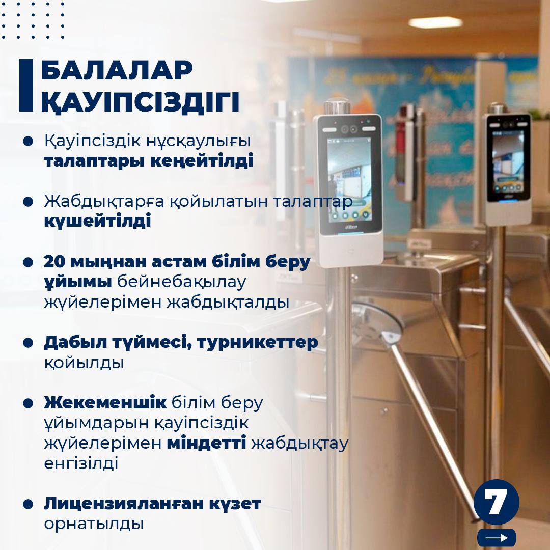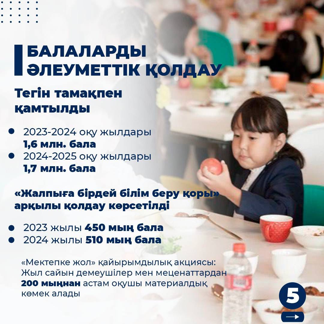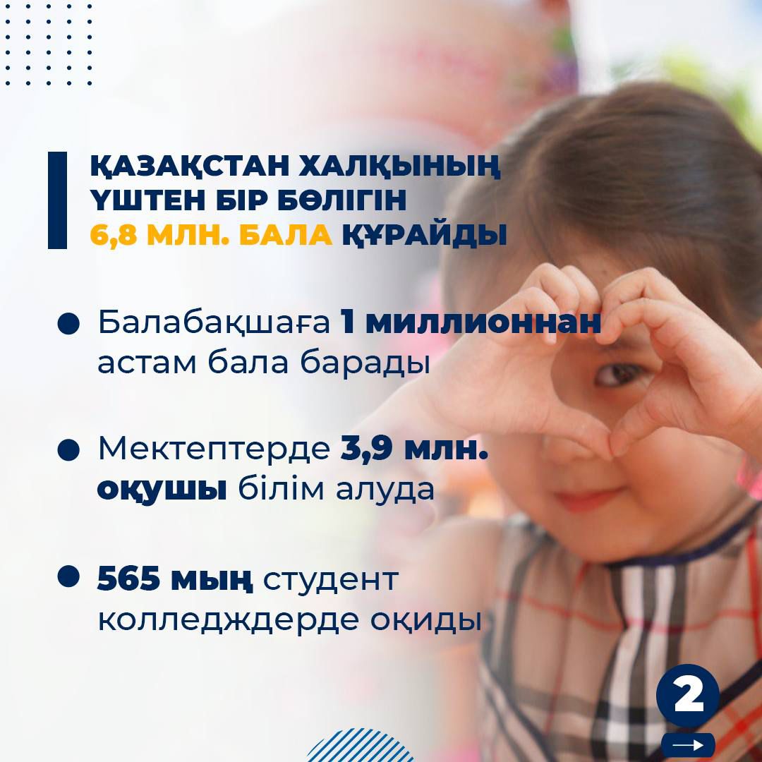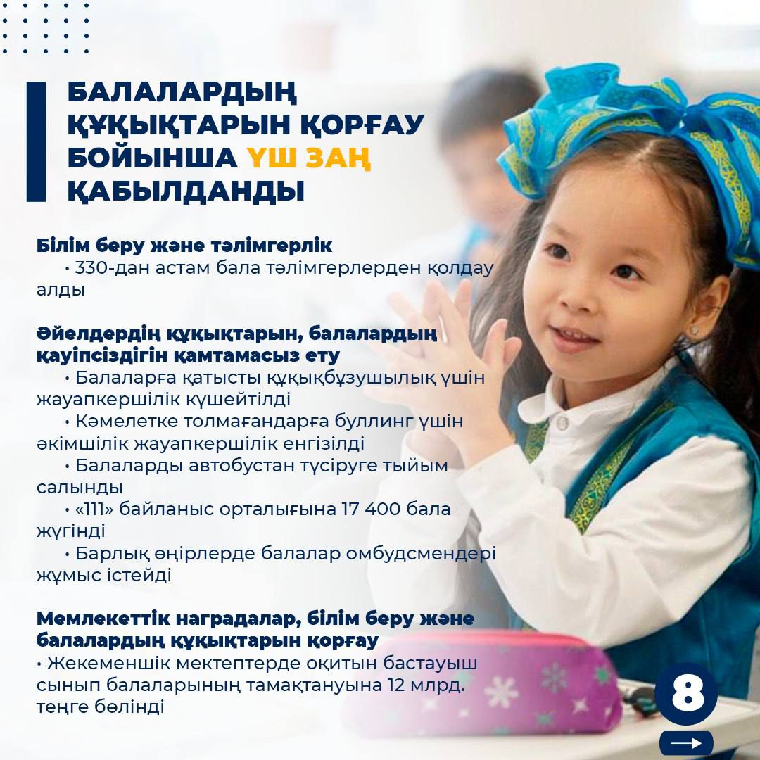 🔹 Бүгінде елімізде 6,8 млн бала тұрады, бұл халықтың үштен бірін құрайды. 2024 жылдың қорытындысы бойынша құқықтық базаны нығайту бойынша үш негізгі заң қабылданды және біздің кішкентай азаматтарымызды қорғау үшін пәрменді тетіктер енгізілді.