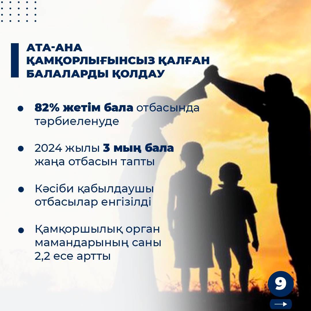 💡 Бүгінгі таңда жетім және ата-ана қамқорлығынсыз қалған балалардың 82%-ы қазақстандық отбасыларда тәрбиеленуде. 2024 жылдың қорытындысы бойынша тағы 3 мыңнан астам бала жаңа отбасын тапты.
