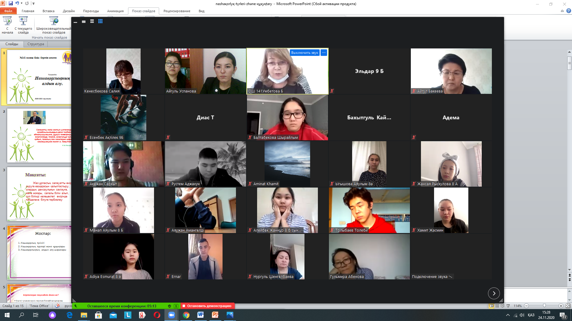 Әуезов ауданы, №141 жалпы білім беретін мектепте 24.11.2020 жылы сағат 15:00-де zoom платформасы арқылы 8,9,10 сыныптар аралығында «Нашақорлықтың алдын-алу» тақырыбында нарколог-дәрігер Кенесбаева С.К қатысуымен онлайн дәріс өткізілді. Қатысқан мұғалімдер саны – 7. Қатысқан оқушылар саны- 86.