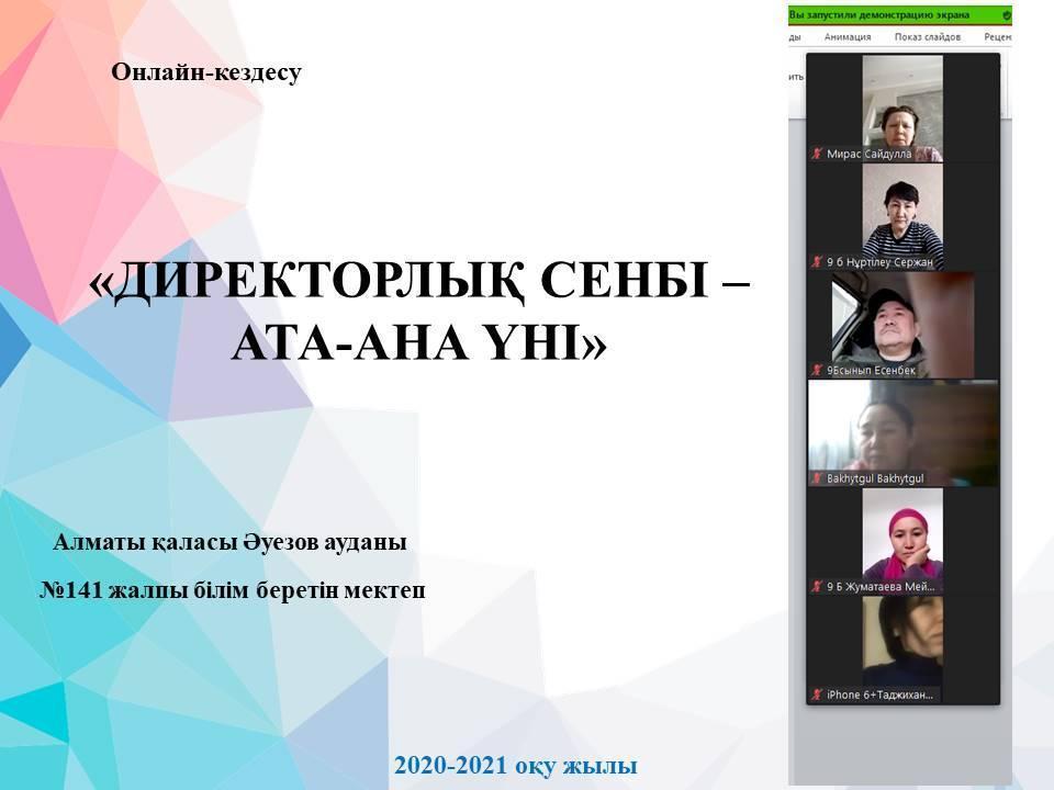 № 141 жалпы білім беретін мектепте "Директорлық сенбі - ата-ана үні" атты онлайн-кездесу өткізілді, оған 9-11 сынып оқушыларының ата-аналары,мектеп директоры, директордың тәрбие ісі жөніндегі орынбасарлары,сынып жетекшілері, мектеп психологы,әлеуметтік педагог қатысты.Онлайн кездесу ұйымдастырғаны үшін ата-аналар тілектер мен ризашылығын білдірді.