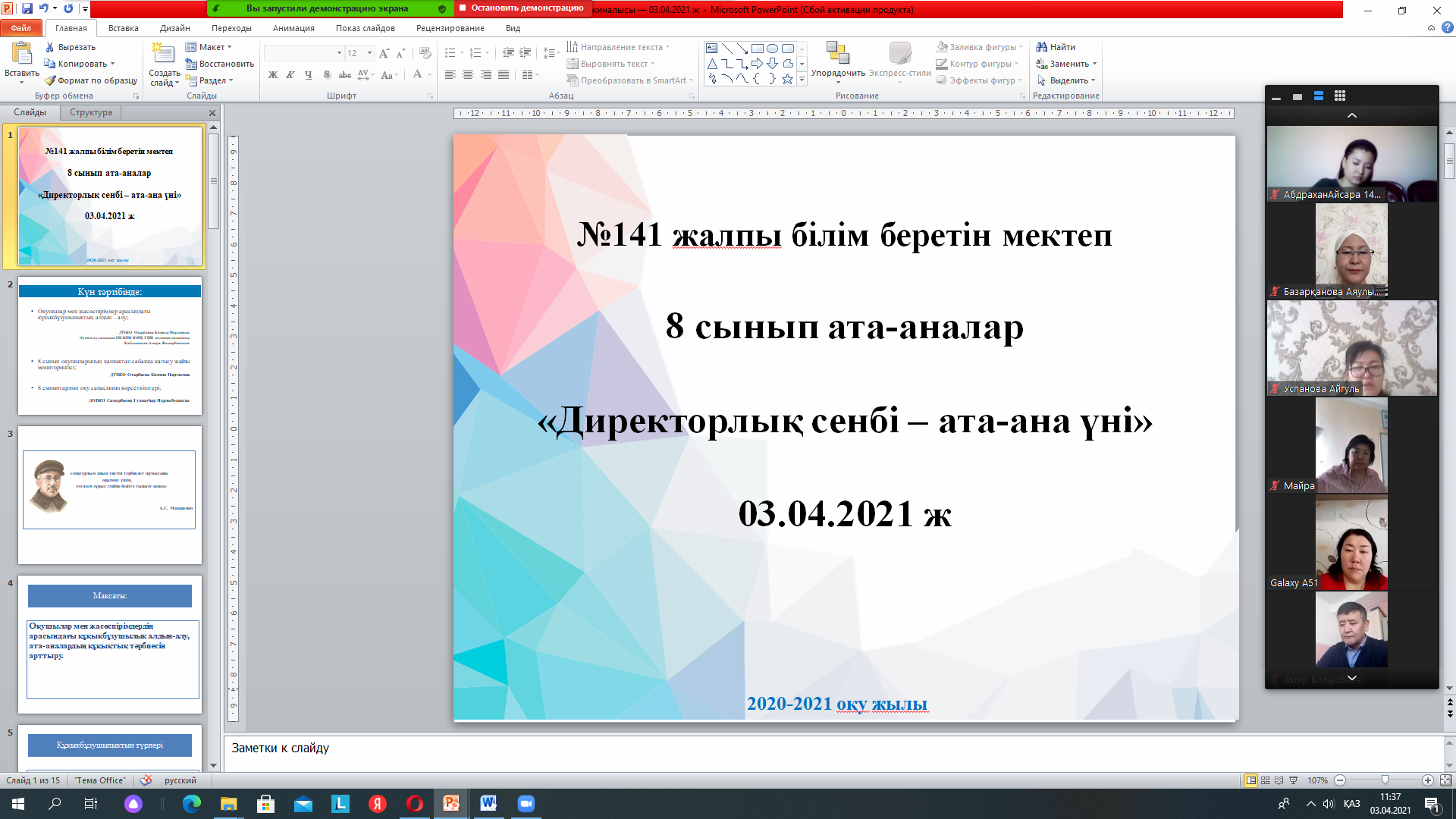 03.04.2021 ж күні № 141 жалпы білім беретін мектепте "Директорлық сенбі - ата-ана үні" атты онлайн-кездесу өткізілді, оған 8 сынып оқушыларының ата-аналары,мектеп директоры, директордың тәрбие ісі жөніндегі орынбасарлары,мектеп инспекторы ,сынып жетекшілері, мектеп психологы,әлеуметтік педагог қатысты.