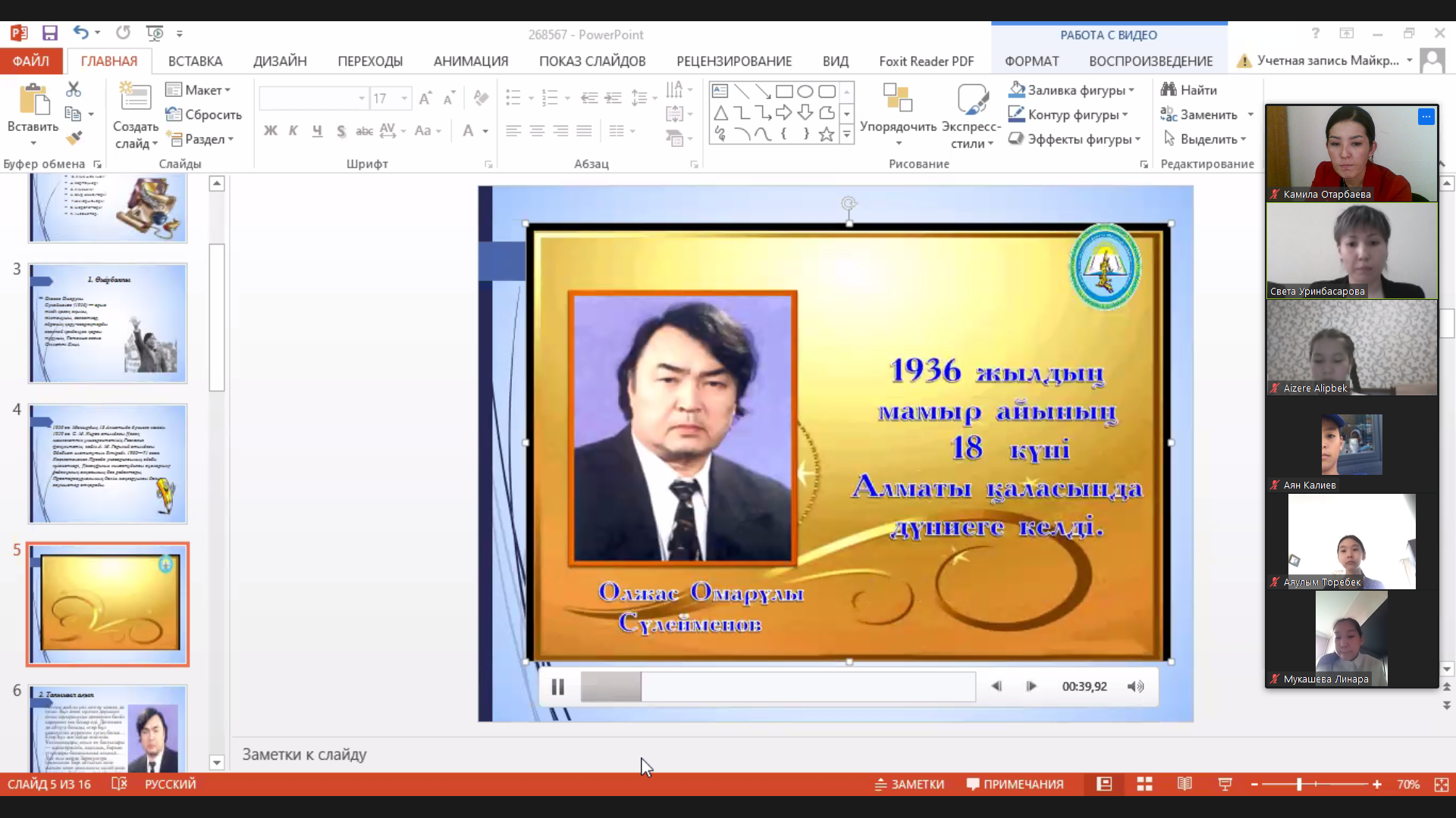 Алматы қаласының білім беру ұйымдарында Қазақстан Республикасы Тәуелсіздігінің 30 жылдығын мерекелеу жөніндегі кеңейтілген іс-шаралар жоспарын орындау мақсатында №141 жалпы білім беретін мектепте Қазақ өнерінің, әдебиеті мен мәдениетінің көрнекті өкілі Олжас Сүлейменовтың 85 жас мерейтойын мерекелеуге арналған сынып сағаты 06.04.2021 ж күні қашықтан 5 «Г» сынып оқушыларымен ашық сабақ өтті.