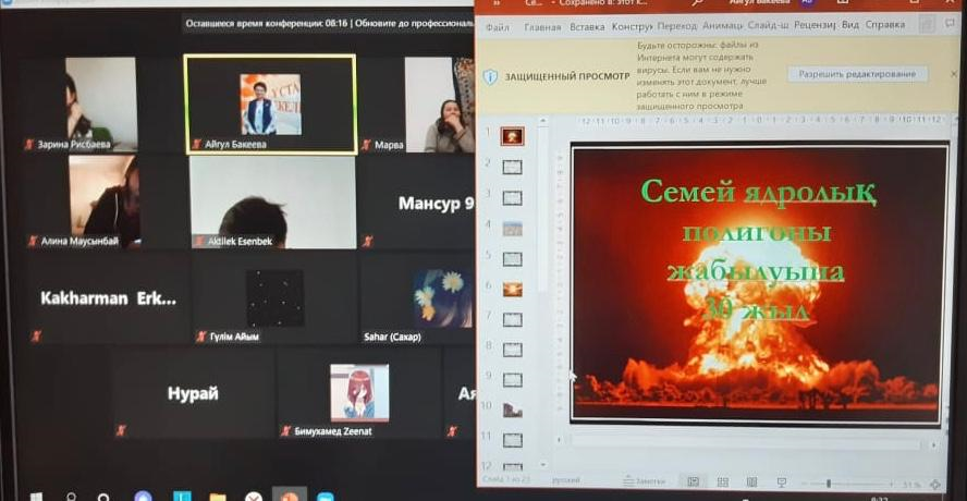 Алматы қаласының білім беру ұйымдарында Қазақстан Республикасы Тәуелсіздігінің 30 жылдығын мерекелеу жөніндегі кеңейтілген іс-шаралар жоспарын орындау мақсатында №141 жалпы білім беретін мектепте Семей ядролық полигоны жабылуының 30 жылдығына арналған 20.04.2021 ж күні қашықтан 9 «Б» сынып оқушыларымен сынып сағаты өтті.