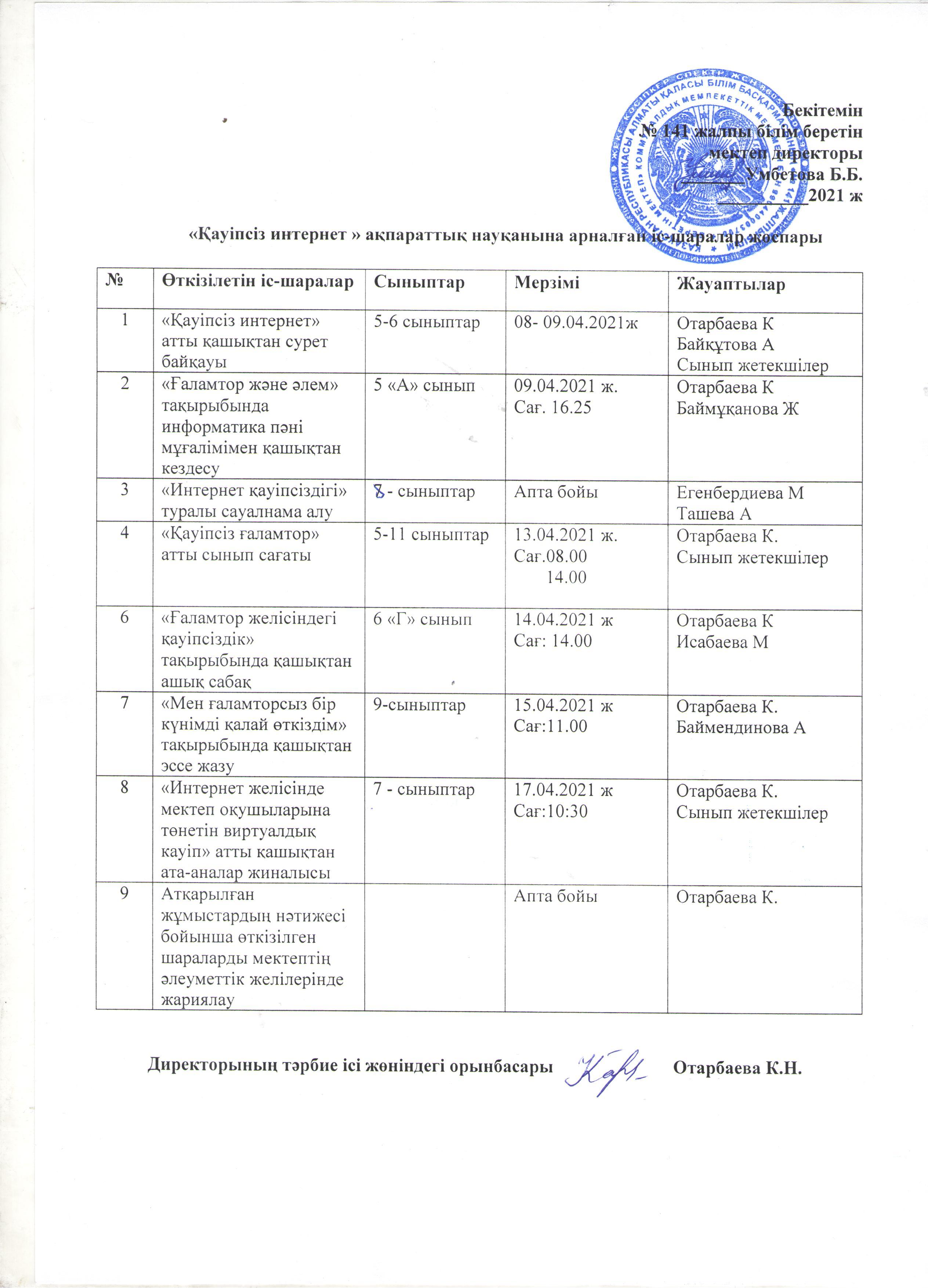 17 апрель 2021 0 1 2 3 4 5 2021 жылы 04-17 сәуір аралығында өткен «Қауіпсіз Интернет» ақпараттық науқаны туралы қорытынды ақпарат 2021 жылы 04-17 сәуір аралығында өткен «Қауіпсіз Интернет» ақпараттық науқаны туралы іс-шаралар жоспары бекітілді. Осы беттің QR-коды:QR-код этой страницы: