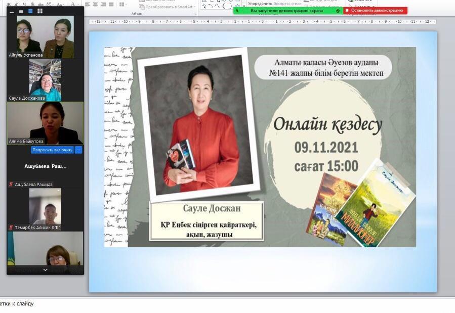 №141 жалпы білім беретін мектепте «Оқуға құштар мектеп» жобасы бойынша 8-сыныптармен жазушы Сауле Досжанның «Ауылдан шыққан миллионер» атты хикаятын оқып, талдау жұмыстары жүргізілді. Осы жұмыс барысында шығарманың авторымен кездесу идеясы туындап, бүгін 09.11.2021ж. «Үлгі болар жол...» деген атпен ҚР Еңбек сіңірген қайраткері, жазушы, ақын, «Ауылдан шыққан миллионер» атты хикаятынының авторы Досжан Сәуле Мағазбекқызымен кездесу ұйымдастырылды.