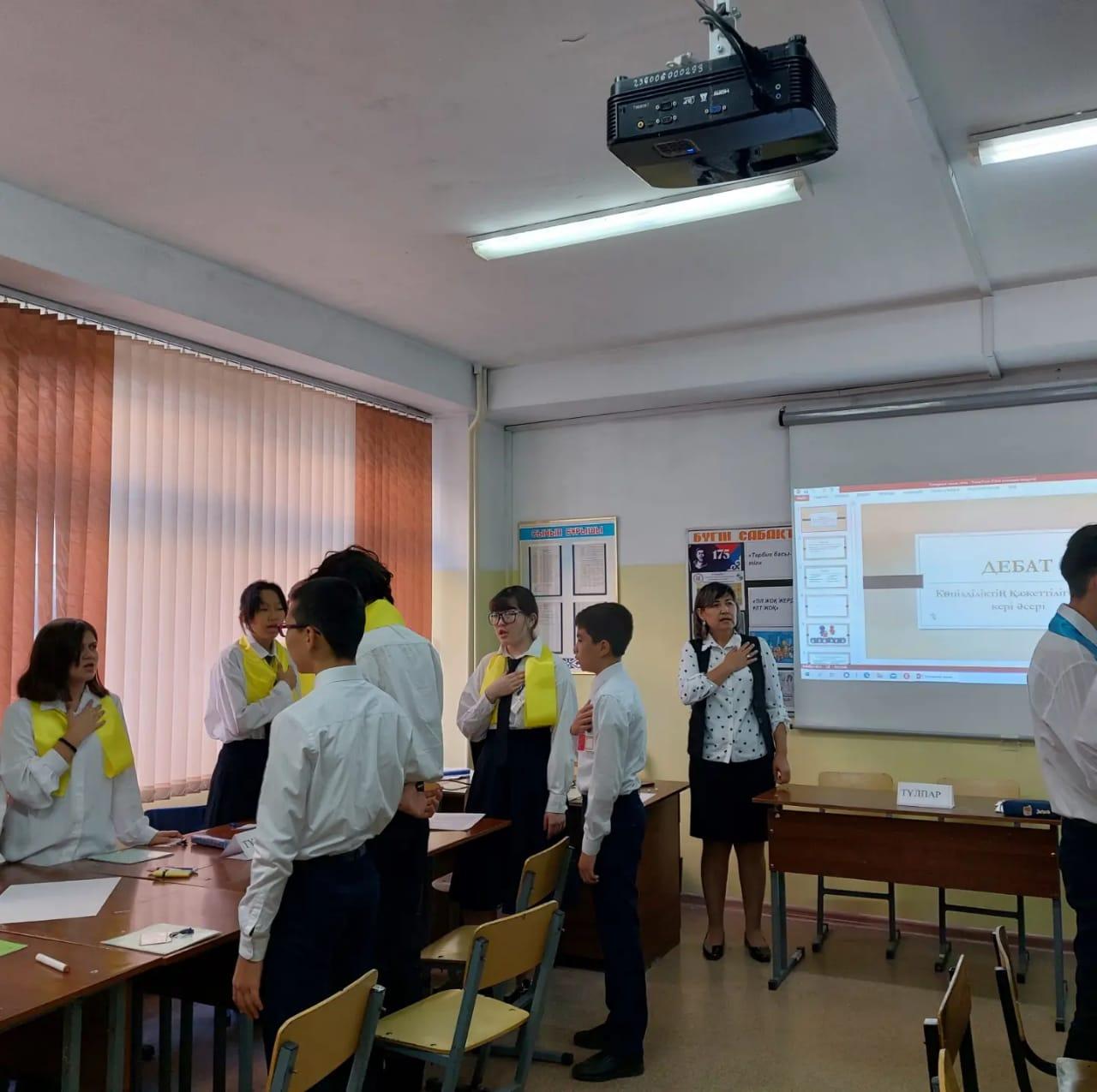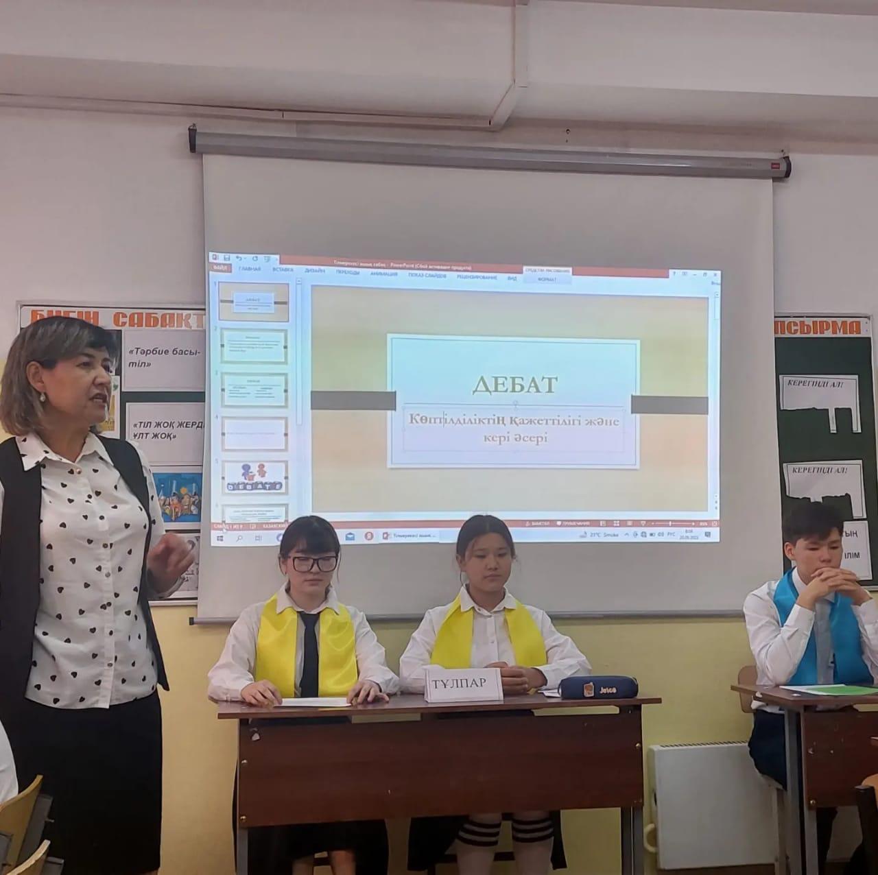 Мақсаты: оқушылардың үштілділік оқу бағдарламасына көзақарастарын анықтау және оқушыларды шешендікке баулу. Дебат-сабақ мақсатына жетіп, жоғары деңгейде өткізілді.