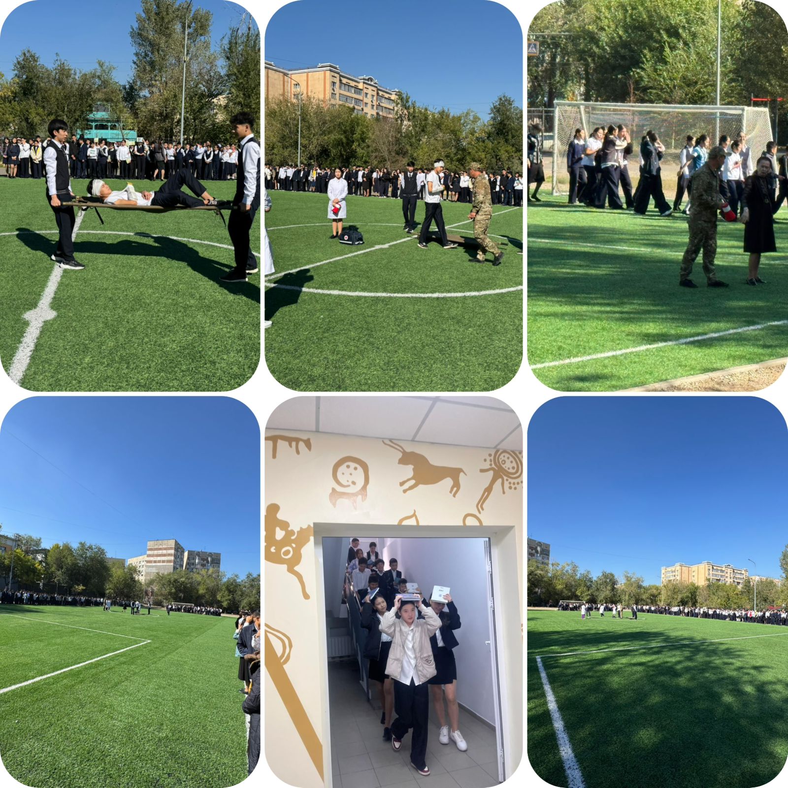 Оқушылар саппен тізіліп,қоғамдық тәртіппен шықты ,алғашқы көмек көрсету, өрт сөндіру жаттығулары ұйымдастырылды.