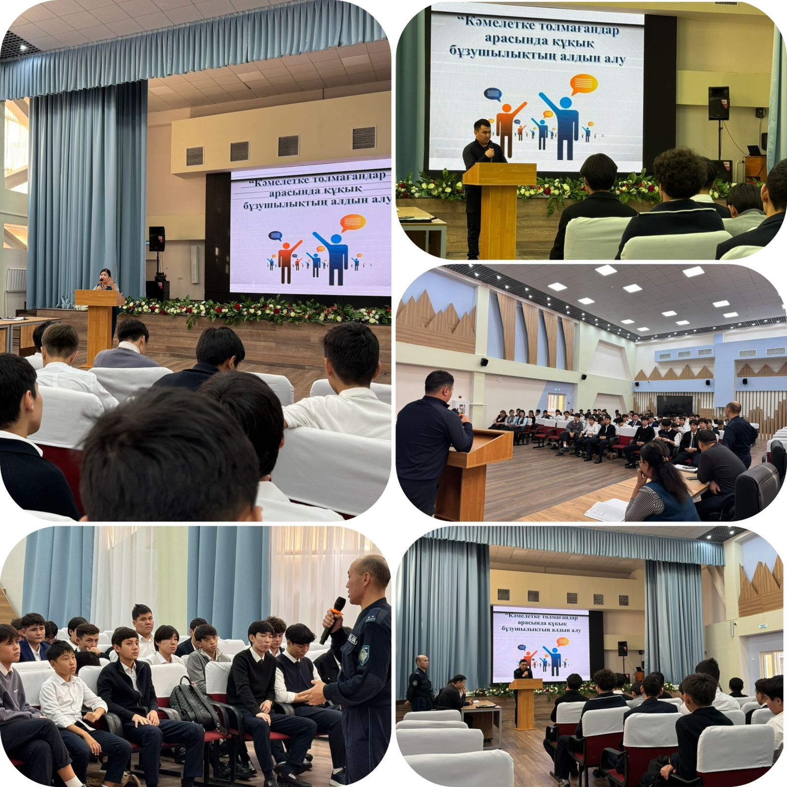 Күні 19.11.2025ж. Қатысушылар: Мектеп әкімшілігі, сынып жетекшілер, әлеуметтік педагог, психолог, 9-10-сынып ұл балалары, полиция майоры Далибаев Адилжан, полиция капитаны Шәуе Дастан, полиция аға лейтенанты Дәмеш Тасқын, полиция лейтенанты, мектеп инспекторы Альменов Бақыт.