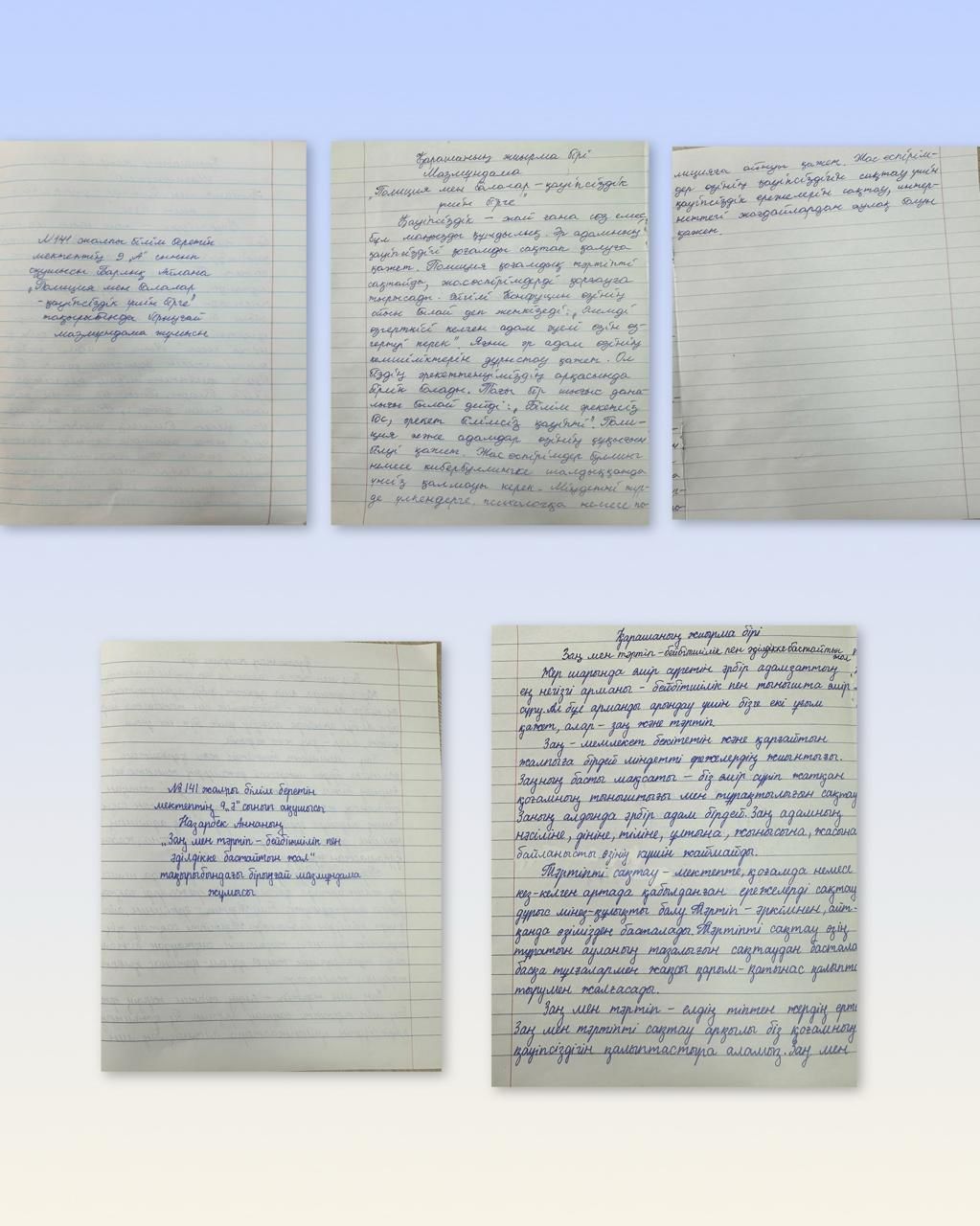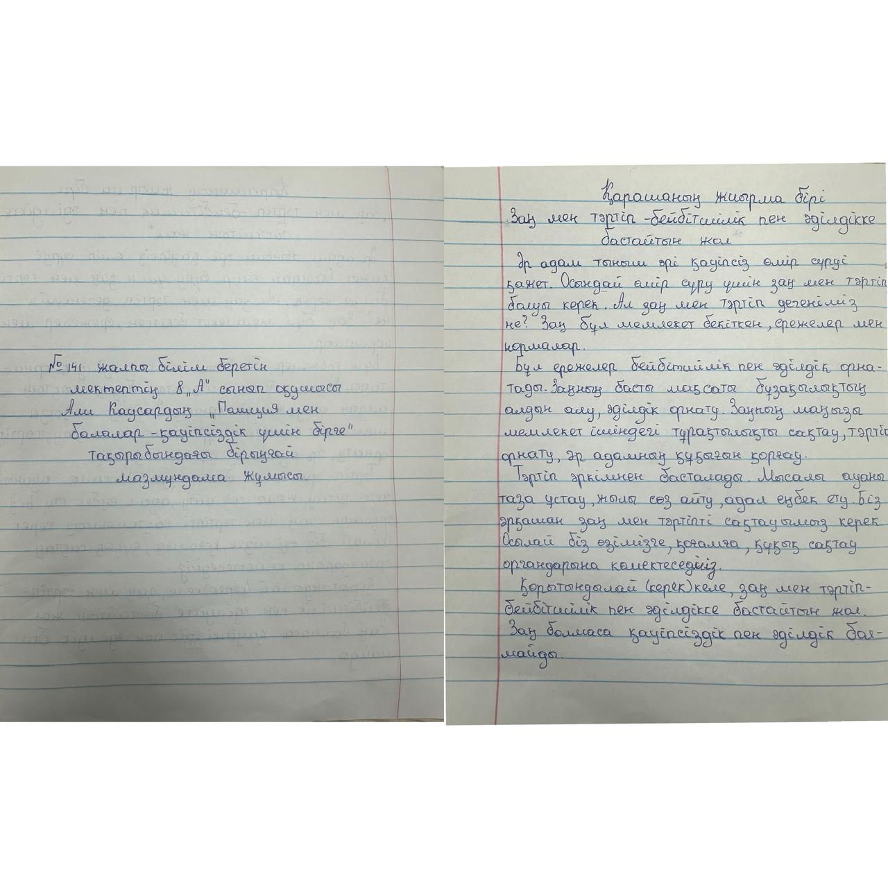 19-тармағына сәйкес «Полиция және балалар – бірге қауіпсіздік үшін» акциясын (2025 жылғы 20 қарашадағы Дүниежүзілік балалар күніне орайластырылған, елдегі барлық мектептерде сынып сағаттары шеңберінде «Полиция және балалар – бірге қауіпсіздік үшін» тақырыбына оқушыларымыз бірыңғай мазмұндама жазды, соның ішіндегі ең үздіктері таңдалып алынды. Мазмұндама алудағы мақсаты: Оқушыларды мейрімділікке тәррбиелеу, балаларды бір-біріне көмек қолын созуға дағдыландыру, бір біріне достық қолдаудың маңыздылығын ұғындыру.