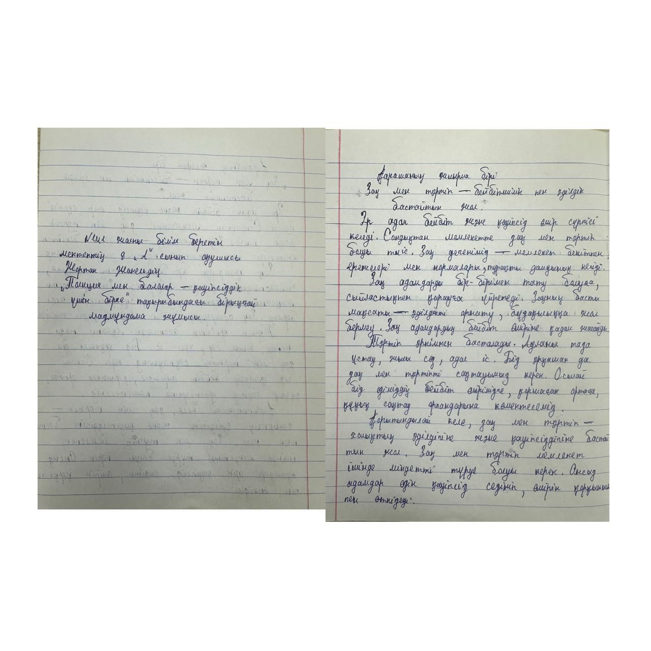 Мектебімізде 7-11 сыныптар арасында 21.11.2025ж Қазақстан Республикасы Оқу-ағарту министрлігінің Тәрбие жұмысы және қосымша білім беру департаменті «Заң және Тәртіп» идеологемасын ілгерілету жөніндегі жобаларды іске асыруды бақылауды бекітудің