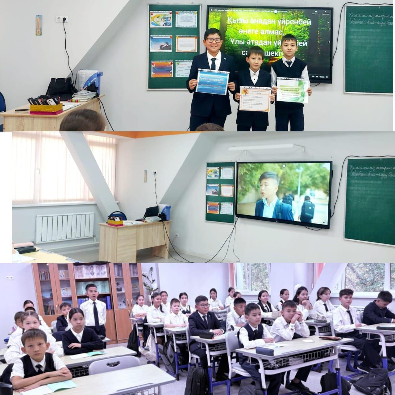 Сынып сағаты барысында оқушылар өз ойларын ортаға салып, үлгілі оқушы болудың жолдары, отбасындағы және мектептегі тәртіп мәдениеті туралы пікір алмасты. Сонымен қатар үлкенді сыйлау мен кішіге қамқор болу – әрбір жас буынның басты парызы екендігіне ерекше назар аударылды.