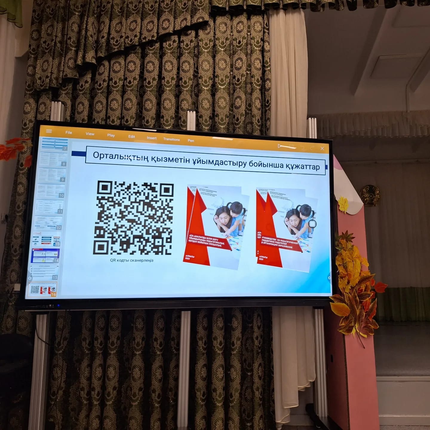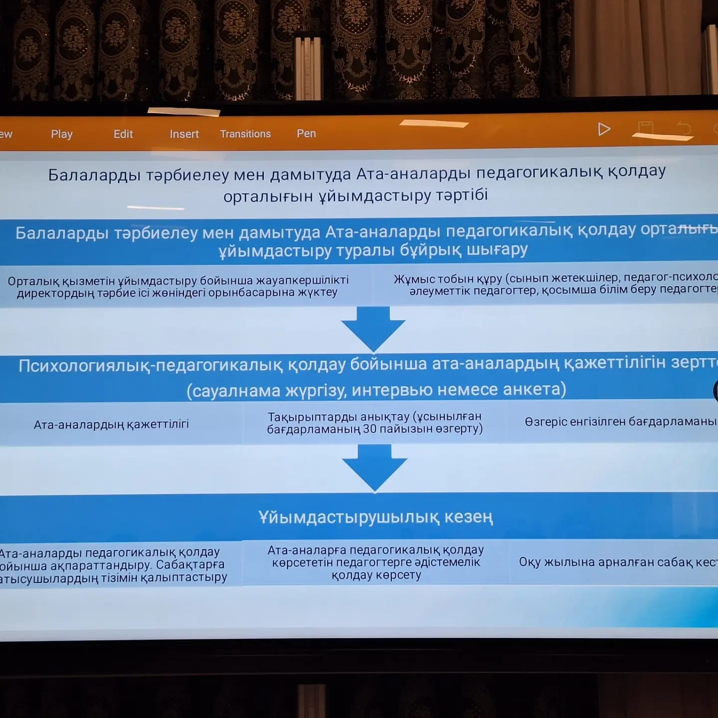 Орта білім беру ұйымдарындағы балаларды тәрбиелеу мен дамыту жөніндегі ата-аналарға педагогикалық қолдау орталығы туралы 2023 жылдың 10 қазанында директордың тәрбие ісі жөніндегі орынбасарларына семинар өтті. Осы Орта білім беру ұйымдарындағы балаларды тәрбиелеу мен дамытуда ата-аналарды немесе заңды өкілдерді (бұдан әрі – ата-аналар) педагогикалық қолдау бойынша әдістемелік ұсынымдар (бұдан әрі – әдістемелік ұсынымдар) балаларды оқыту және тәрбиелеу мәселесі бойынша мектептің ата-аналармен қарым-қатынасын күшейту, сондай-ақ берекелі отбасы мәдениетін дамыту мақсатында әзірленді.Балаларды тәрбиелеу мен дамытуда ата-аналарды педагогикалық қолдауды ұйымдастыру тәртібі туралы "Өркен" ғылыми-практикалық балалардың хал-ахуалы институтының мамандары мәліметтермен бөлісті.