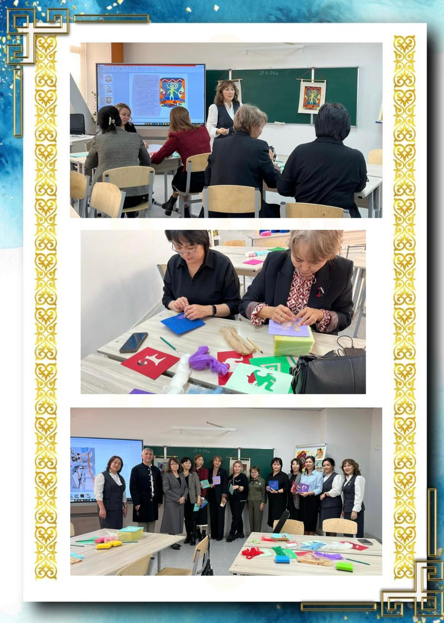 2. Көркем еңбек пәнінің мұғалімі Кабулова Б.Л "Құрғақ жүннен сурет салу" шеберлік сабағын аудан мектептерінің мұғалімдерімен өткізді.