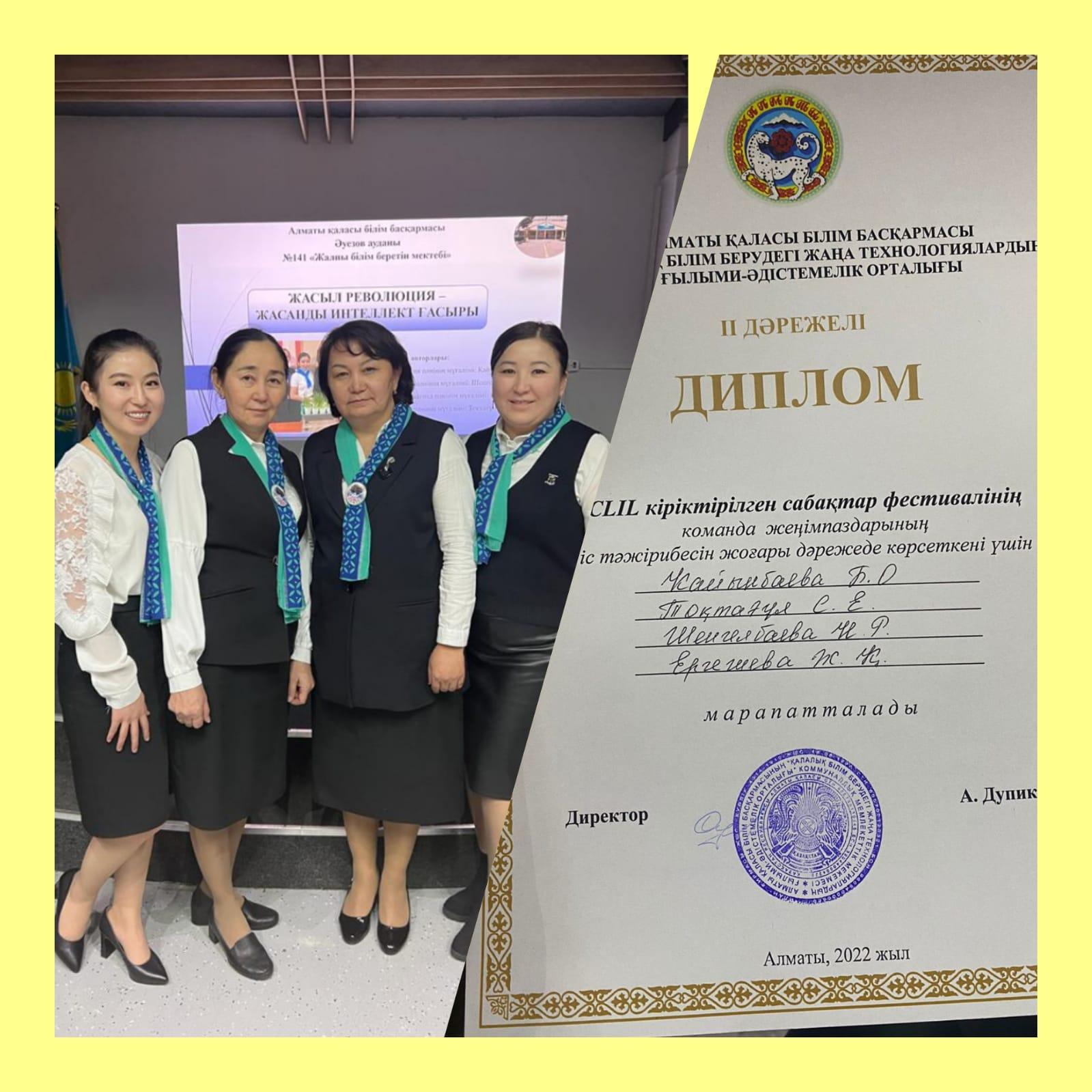 Алматы қаласы Білім басқармасы Қалалық білім берудегі жаңа технологиялардың ғылыми- әдістемелік орталығы СLIL кіріктірілген сабақтар фестивалінің команда жеңімпаздарының іс тәжірибесін жоғары дәрежеде көрсеткені үшін № 141 жалпы білім беретін мектептің мұғалімдері Кайынбаева Б.О, Шенгелбаева Н.Р, Ергешова Ж.Қ, Тоқтағұл С.Е ІІ дәрежелі дипломмен марапатталады. Құттықтаймыз!