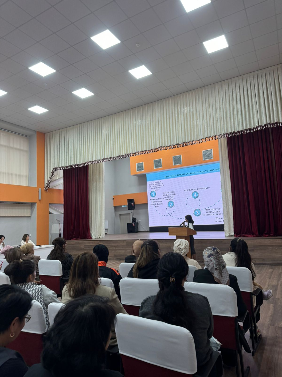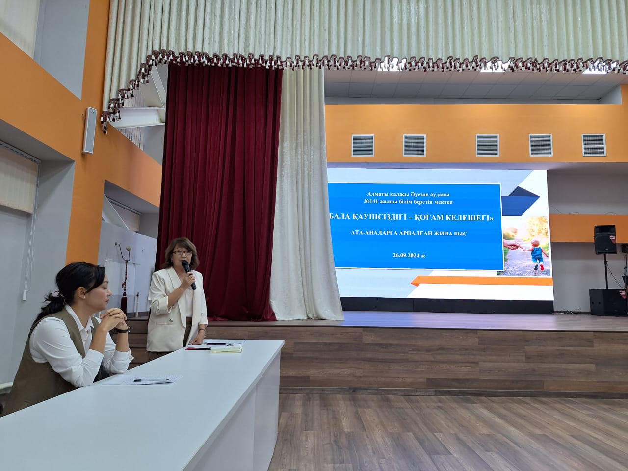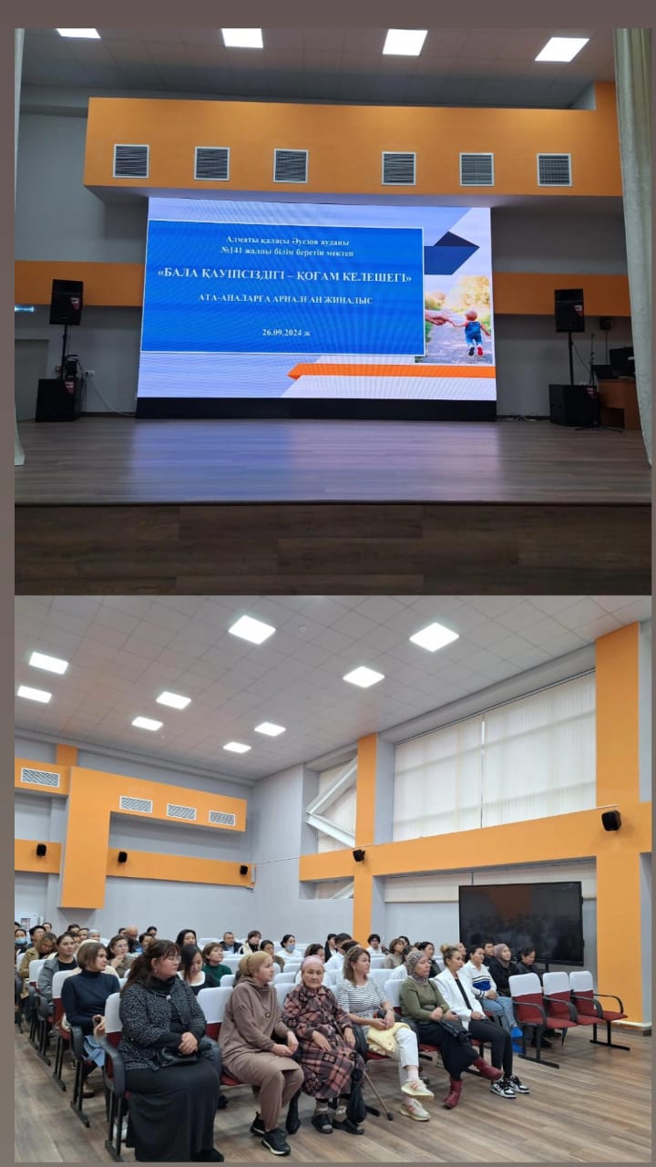 Алматы қаласы Әуезов ауданы №141 жалпы білім беретін мектепте 26.09.2024 ж күні «БАЛА ҚАУІПСІЗДІГІ – ҚОҒАМ КЕЛЕШЕГІ» атты 1-11 сыныптар арасында оффлайн жиналыс өткізілді. Күн тәртібінде балалардың қауіпсіздігін қамтамасыз ету шараларын өзектендіру. Ата-аналарға арналған жиналысты мектеп директоры Умбетова Балжан Базархановна кіріспе сөз алып, қазіргі қоғамды алаңдататын өзекті мәселелердің бірі-балалардың әлеуметтік желілердегі қауіпсіздігін талқылау үшін жиналғандығын айтып өтті. Негізгі бөлімде директордың тәрбие ісі жөніндегі орынбасары К.Н.Отарбаева әлеуметтік желідегі негізгі қауіптердің түрлерін атап, қауіптердің алдын алу үшін ата-аналар не істеу керек екендігін, ата-ана бақылауының маңызды екенін атап өтіп, ата-аналарға нақты ұсыныстар ұсынды. Мектептегі психологиялық қолдау орталықтары туралы ақпарат беріп, орталықтың сенім телефондарымен тәулік бойы жұмыс істейтін бірыңғай, тегін мемлекеттік байланыс орталығы туралы ақпарат берді. Жиналыстың екінші бөлімінде «Сенімен болашақ» республикалық қоғамдық бірлестігінің Алматы қаласы филиал директоры Меруерт Мәулетқызы мен «Сенімен болашақ» эксперті, тәжірибелі психолог, коуч-тренер Аширова Айгүл Исламбекқызы ата-аналарға пайдалы ақпараттар мен кеңестер беріп өтті. Жиналысқа 150-ден аса ата-ана қатысып, кері байланыс орнатып, белсенділік танытып отырды. Құрметті ата-ана! Сіздің шынайы, жылы сөзіңіз баланың болашағындағы ең құнды қазыналардың бірі болмақ. Сіздердің балаларыңыздың өміріне қосқан үслестеріңіз баға жетпес. Тек күш біріктіре отырып, біз оларға мектепте де, үйде де қауіпсіз орта жасай аламыз. Осы маңызды жұмысқа қатысқаныңыз үшін алғыс білдіреміз.