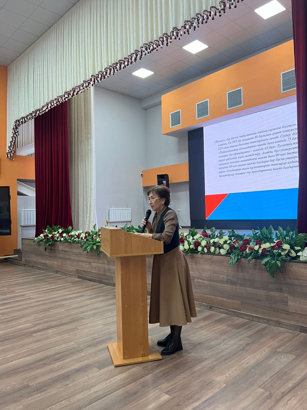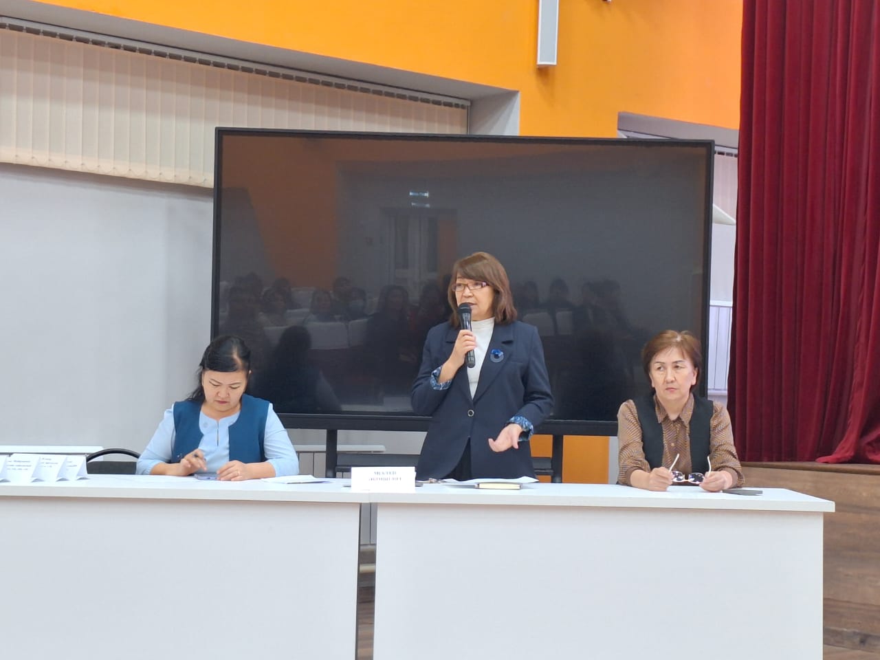 Мектеп директоры Умбетова Б.Б. сөз алып, жиналыстың күн тәртібімен таныстырды. Жиналыстың бірінші бөлімінде директордың оқу ісі жөніндегі орынбасары Садырбаева Г.Н. «Бүгінгі оқушы-ертеңгі маман» атты баяндамасында Қазақстандағы жоғары оқу орындарының гранттары туралы мәлімет және мектеп түлектерінің соңғы үш жылдағы жоғары оқу орнына түсу мониторингісімен таныстырып өтті.