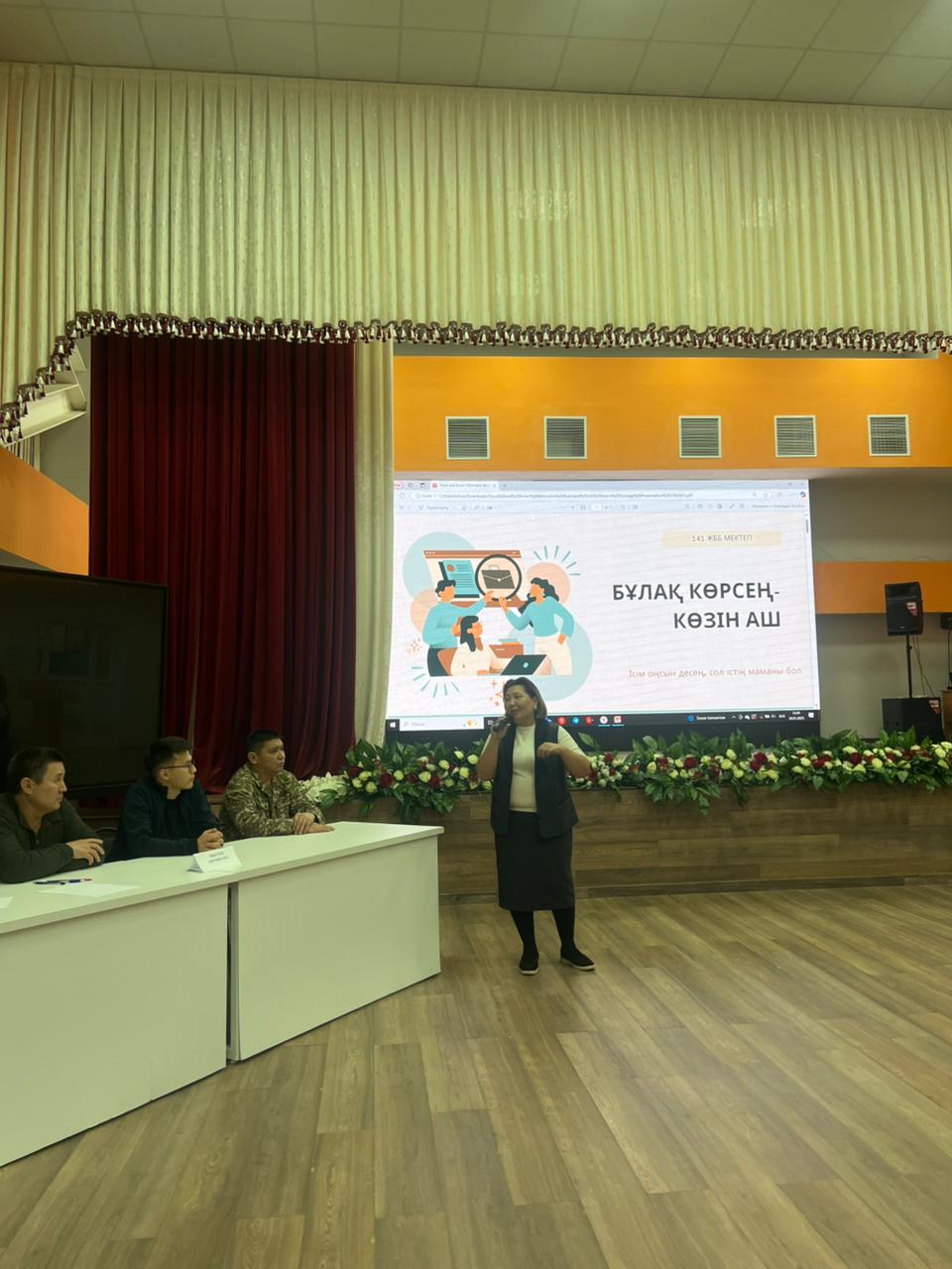 Мектебімізде 30.01.2025ж. Біртұтас тәрбие бағдарламасының «Еңбегі адал жас өрен» атты әлеуметтік жоба аясында білім алушылардың әртүрлі мамандыққа деген қызығушылығын арттыру және еңбекқорлық идеясы арқылы құндылықтарды дәріптеу мақсатында 10-11-сынып оқушыларының ата-анасымен жиналыс өткізілді.