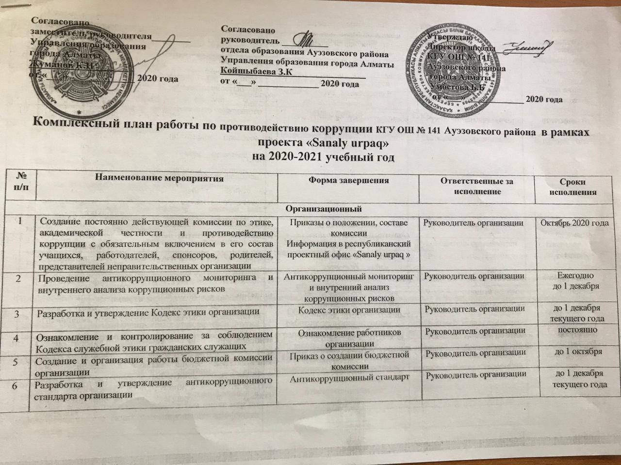 33 | Организация и проведение к Международному дню борьбы с коррупцией мероприятий, направленных на формирование в обществе нетерпимости к коррупционному поведению | Проведение мероприятии | Руководитель организации | Ежегодно до 1 декабря |