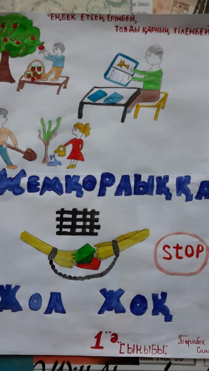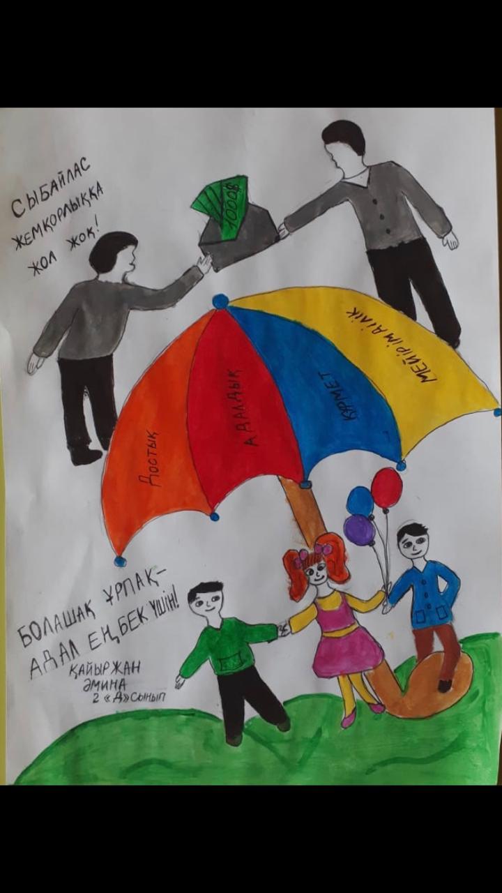 9 желтоқсан –Халықаралық жемқорлыққа қарсы күрес күніне орай «Адал ұрпақ» еріктілер клубының ұйымдастыруымен 1-4 сыныптар арасында «Адал және сатылмайтын еңбек бейнесі», 5-6 сыныптар үшін «Адал еңбек бейнесі» атты сурет байқауы болып өтті. Әр бір оқушы өз шығармасында адал аңбекті сипаттауға, қоғамдағы сыбайлас жемқорлыққа жол бермеуге тырысты. Осындай тақырыптық сурет байқауларын өткізу арқылы оқушылардың бойына, адалдық, адал еңбек, парасаттылық, адамгершілік сияқты т.б. басқа жақсы қасиеттерді бойларына сіңіретіндігі сенімдіміз.