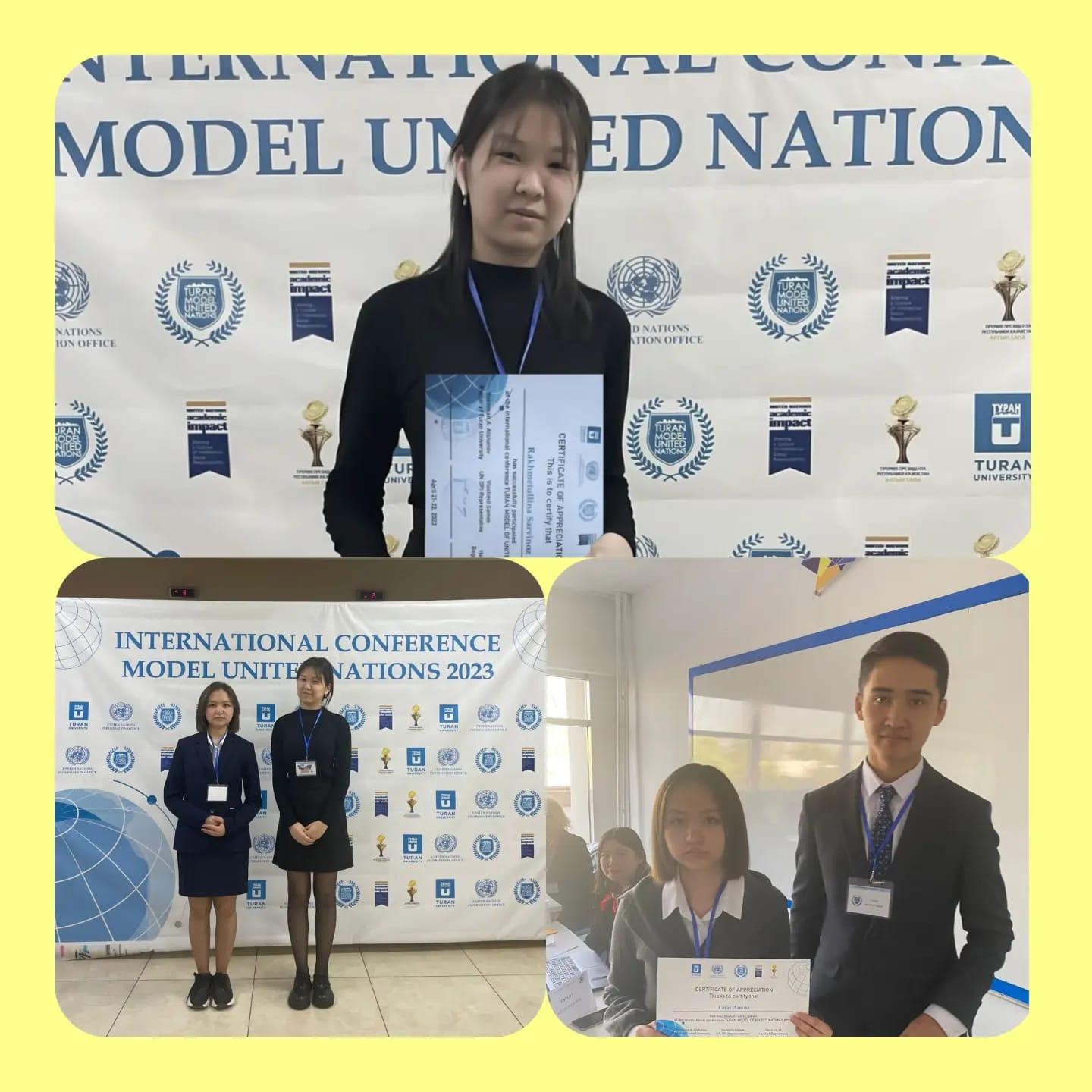 21.04-22.04.2023ж күндері Тұран Университетінің "Аймақтану және халықаралық қатынастар " кафедрасында өткен "Тұран Біріккен Ұлттар Ұйымы моделі-2023" атты халықаралық конференция жеңімпаздары №141 жалпы білім беретін мектептің 10"А" сынып оқушылары Рахметтуллина Сарбиназ, Тұрар Амина марапатталды. Ғылыми жетекшісі: Мусралинова Д.С. Құттықтаймыз!