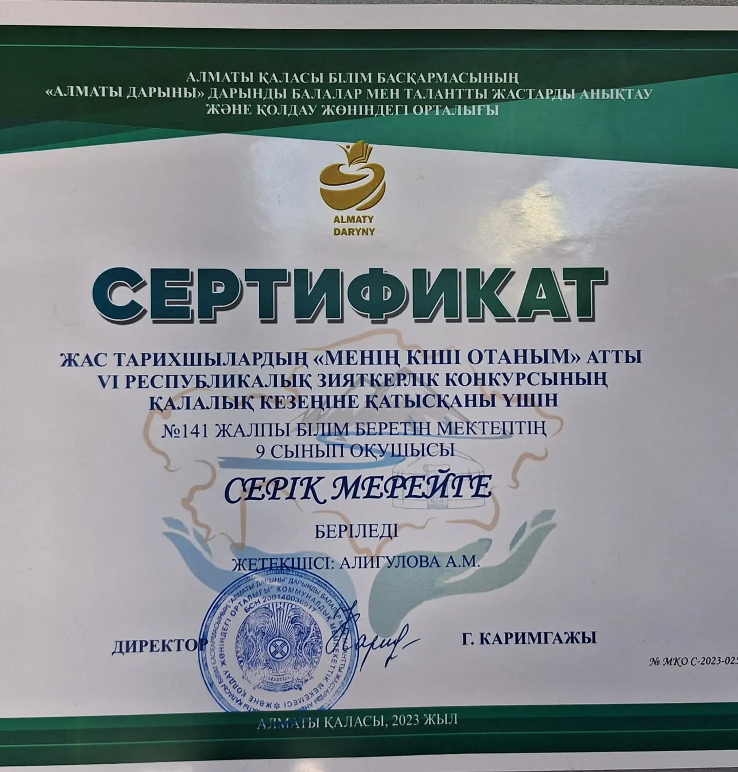 Жас тарихшылардың "Менің кіші Отаным" атты VI Республикалық зияткерлік конкурсының қалалық кезеңіне қатысып, жүлделі ІІІ орын иеленгені үшін №141 ЖББМ-тің 9" Ә" сынып оқушысы Серік Мерей марапатталады. Жетекшісі: Алигулова А. М