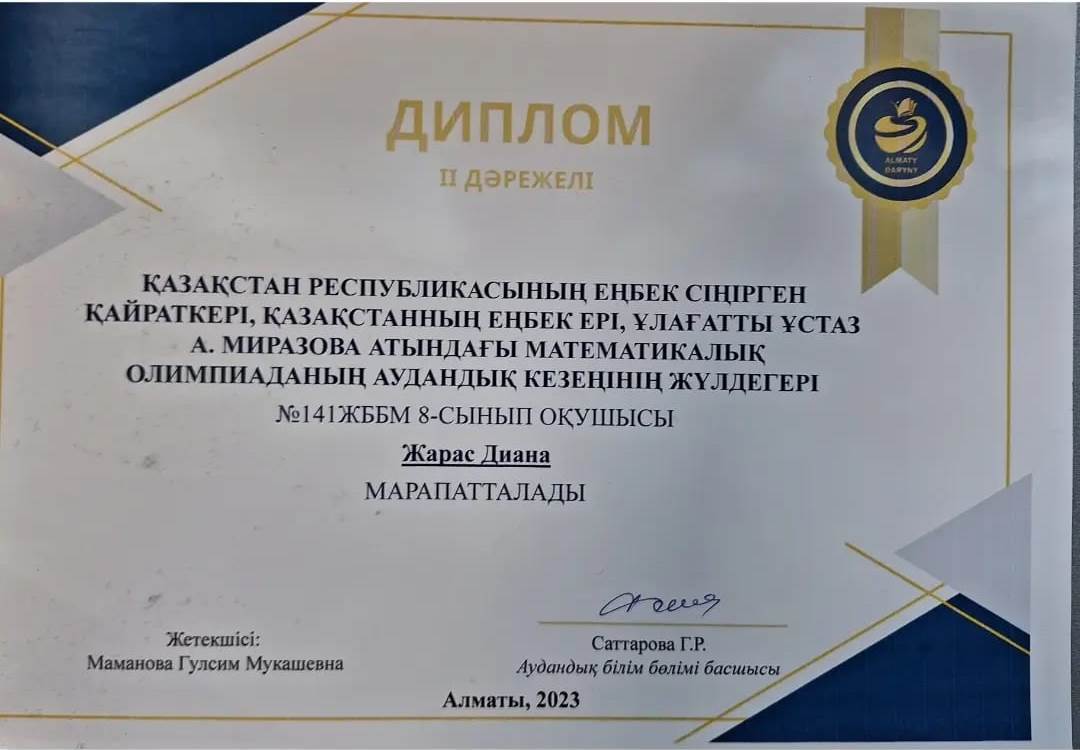ҚР РЕСПБУЛИКАСЫНЫҢ ЕҢБЕК СІҢІРГЕН ҚАЙРАТКЕРІ, ҚАЗАҚСТАННЫҢ ЕҢБЕК ЕРІ, ҰЛАҒАТТЫ ҰСТАЗ, А.МИРАЗОВА АТЫНДАҒЫ МАТЕМАТИКАЛЫҚ ОЛИМПИАДАНЫҢ АУДАНДЫҚ КЕЗЕҢІНІҢ ЖҮЛДЕГЕРІ №141 ЖАЛПЫ БІЛІМ БЕРЕТІН МЕКТЕПТІҢ 8"В" СЫНЫП ОҚУШЫСЫ ЖАРАС ДИАНА МАРАПАТТАЛАДЫ. ЖЕТЕКШІСІ: МАМАНОВА ГУЛСИМ МУКАШЕВНА. ҚҰТТЫҚТАЙМЫЗ!