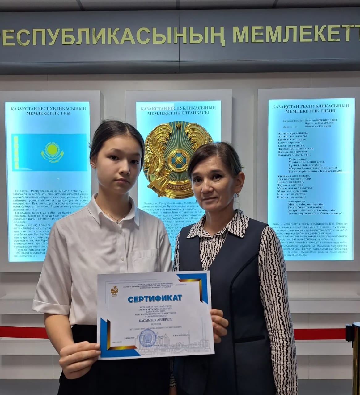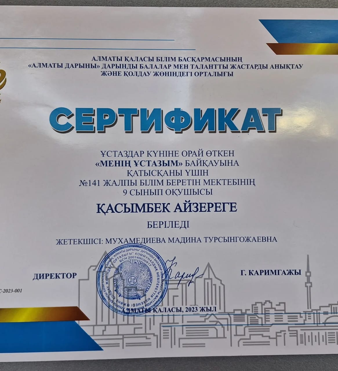 Ұстаз күніне орай өткен "Менің ұстазым" байқауына қатысқаны үшін №141 ЖББМ-тің 9 "В" сынып оқушысы Қасымбек Айзереге "Алматы дарыны" дарынды балалармен мен талантты жастарды анықтау және қолдау жөніндегі орталығының сертификатымен марапатталды. Жетекшісі: Мухамедиева Мадина Турсынгожаевна!
