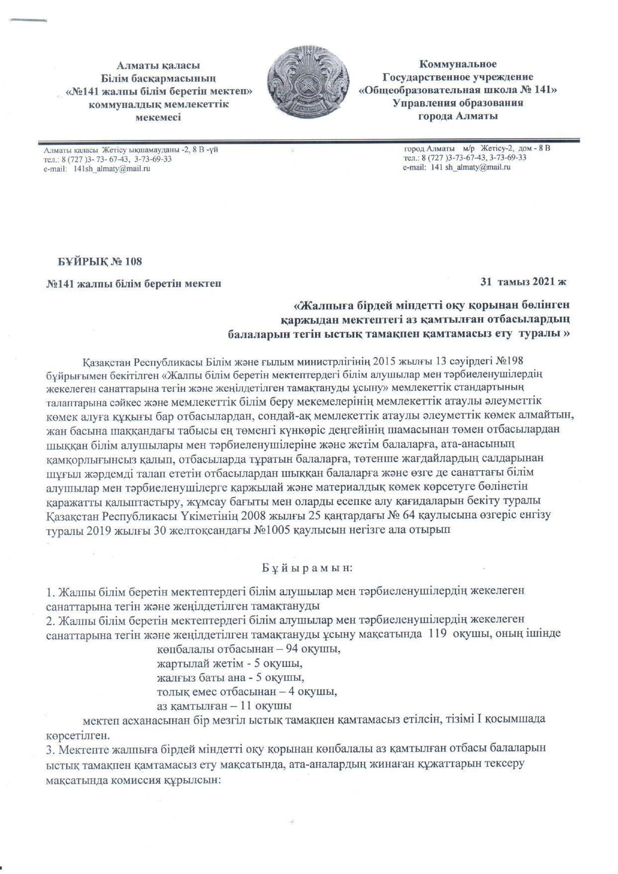 КГУ "Общеобразовательная школа №141" » Тамақтандыру » Жалпыға бірдей міндетті оқу қорынан бөлінген қаржыдан мектептегі аз қамтылған отбасылардың балаларын тегін ыстық тамақпен қамтамасыз ету туралы бұйрық 2021-2022 оқу жылы