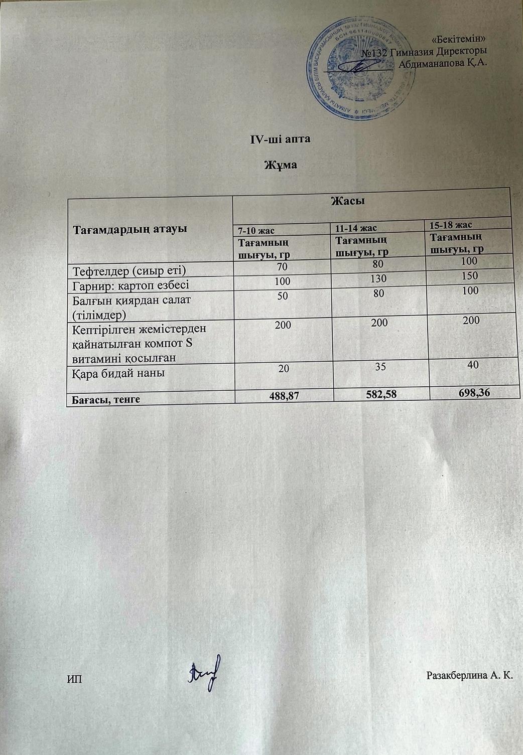 ІІІ апта, Жұма күнгі ас мәзірі