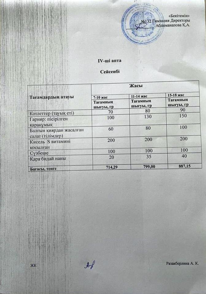 » IV-апта, Сейсенбі күнгі ас мәзірі